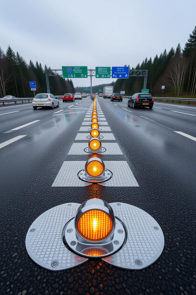 Reflective studs, commonly known as cat’s eyes, are small, retroreflective markers embedded in motorways to guide drivers by reflecting vehicle headlights, enhancing visibility in low-light or adverse weather conditions.